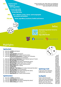Es stehen viele verschiede Brett-, Action- und Kartenspiele zur Verfügung und die Kinder, Jugendlichen und Familien können vorbeikommen, diese ausprobieren und spielen.