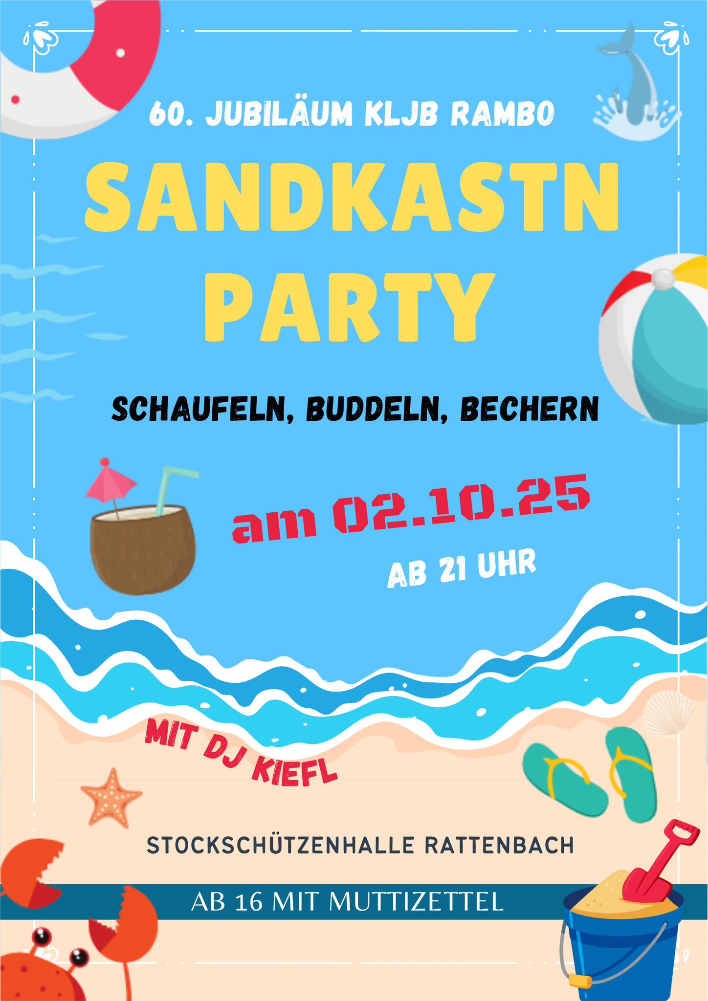 Zu unserem 60-jährigen Jubiläum haben wir, die KLJB Rattenbach, uns eine spezielle Idee einfallen lassen. Wir machen die Stockschützenhalle zu einem warmen Ort am Strand. Wir freuen uns mit euch zu feiern und haben uns richtig ins Zeug gelegt für einen unvergesslichen Abend. Die Party ist ab 16 Jahren mit Muttizettel.